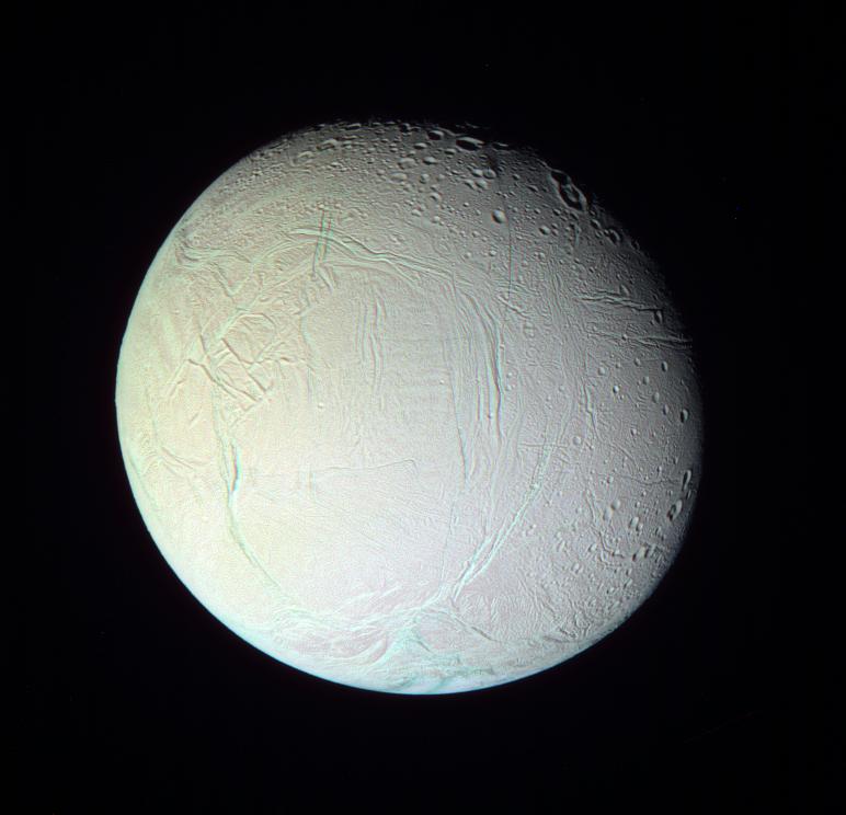 The color difference across the moon's surface (a subtle gradation from upper left to lower right) could indicate broad-scale compositional differences across the moon's surface. It is also possible that the gradation in color is due to differences in the way the brightness of Enceladus changes toward the limb, a characteristic which is highly dependent on wavelength and viewing geometry.