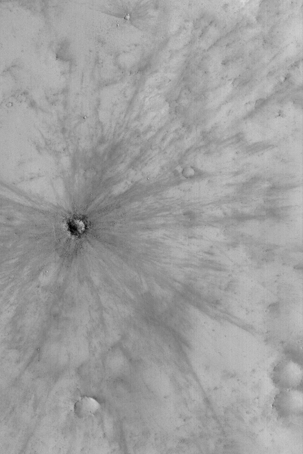 This Mars Global Surveyor (MGS) Mars Orbiter Camera (MOC) picture shows a young, fresh meteor impact crater in southeast Arabia Terra acquired in August 2003. The crater is inferred to be young because it still has a finely detailed pattern of rays associated with its ejecta. These rays formed in a dusty mantle that covers the other craters and rocky terrain at this locale. The crater is young enough that there has not been sufficient time for new dust to cover the rays, or for winds to erase them. The small dark dots associated with the crater are boulders. The boulders were ejected by the impact event. This crater is located near 6.9°S, 317.1°W. The picture covers an area approximately 3 km (1.9 mi) wide and is illuminated by sunlight from the lower left.