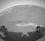 The Mars Exploration Rover Opportunity dragged one of its wheels back and forth across the sandy soil at Meridiani Planum to create a hole (bottom of image) measuring approximately 50 centimeters (19.7 inches) long by 20 centimeters (7.9 inches) wide by 9 centimeters (3.5 inches) deep. The rover's instrument deployment device, or arm, will begin studying the fresh soil at the bottom of this trench later today for clues to its mineral composition and history. Scientists chose this particular site for digging because previous data taken by the rover's miniature thermal emission spectrometer indicated that it contains crystalline hematite, a mineral that sometimes forms in the presence of water. The brightness of the newly-exposed soil is thought to be either intrinsic to the soil itself, or a reflection of the Sun. The rock outcrop lining the inner edge of the small crater encircling the rover and lander can be seen on the horizon. This fish-eye image was taken by the rover's hazard-avoidance camera.