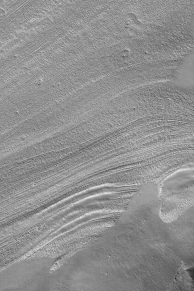 This December 2003 Mars Global Surveyor (MGS) Mars Orbiter Camera (MOC) image shows lineated textures on the floor of a valley in the Deuteronilus region of Mars. Deuteronilus, and neighboring Protonilus and Nilosyrtis, have been known since the Mariner 9 mission as regions of "fretted terrain." In this context, "fretted" does not mean "worried," it means "eroded." The fretted terrains of Mars are regions along the boundary between cratered highlands and northern lowland plains that have been broken-down into mesas, buttes, and valleys. On the floors of some of these valleys occurs a distinctive lineated and pitted texture--like the example shown here. The cause of the textures is not known, although for decades some scientists have speculated that ice is involved. While this is possible, it is far from a demonstrated fact. This picture is located near 40.1°N, 335.1°W, and covers an area approximately 3 km (1.9 mi) wide; sunlight illuminates the scene from the lower left.