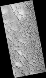 Between the dunes, the underlying surface of the northern plains can be seen. In places, it has been fractured into polygonal blocks, suggesting that water ice is or was present below the surface. Meter-size blocks are also seen in places in this image and elsewhere on the northern plains. The origin of these blocks is not known, but they may be remnants of erosion of material that once covered this region.