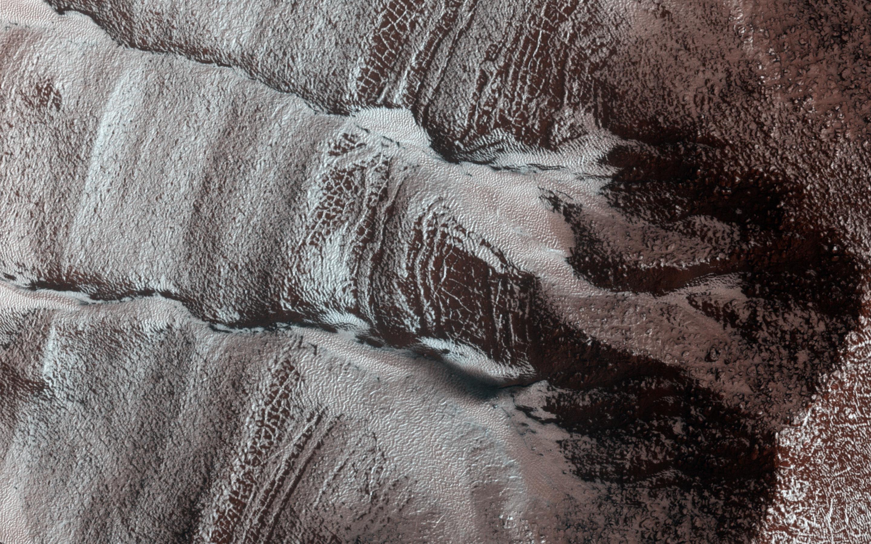 Carbon dioxide frost covers much of the region and helps to reveal subtle textures in the landscape. The layered sediment visible in the walls of the pit and in which these gullies formed likely originally filled much of the impact crater.