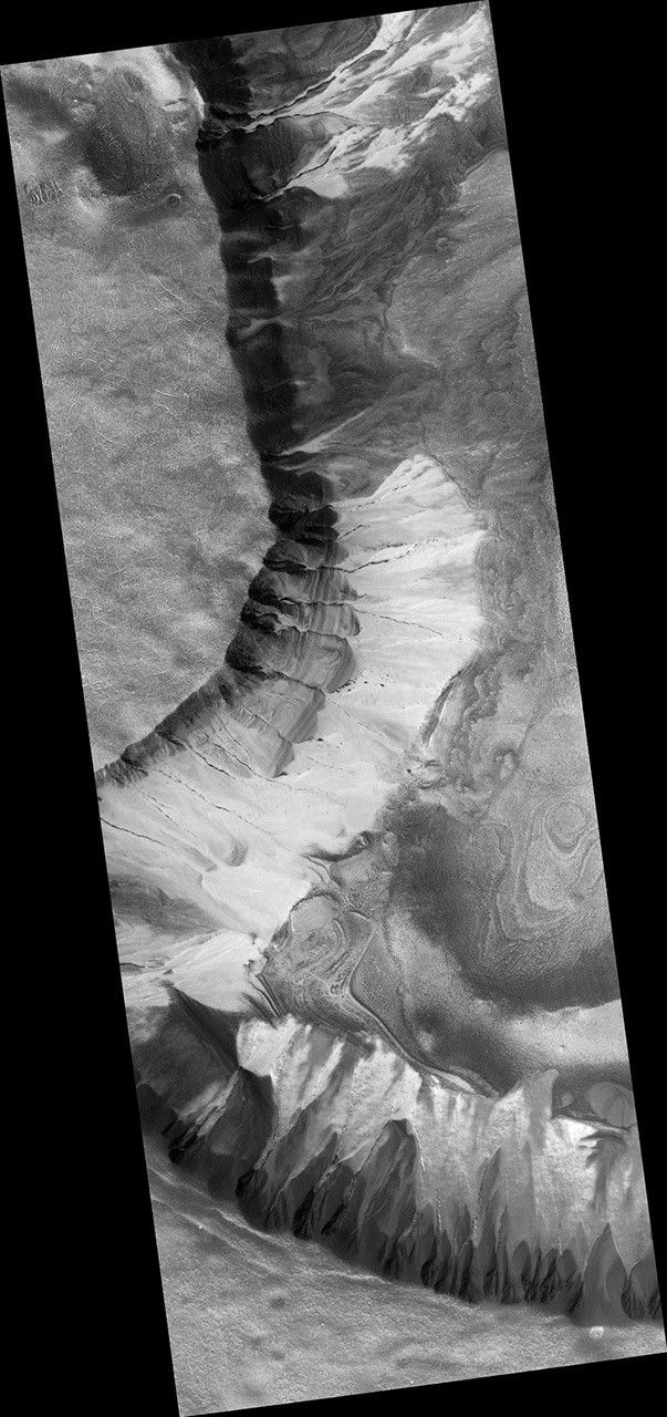 Evidence for a variety of processes abound in this region. The dark, low albedo spots along some of the gullies and on the frosted debris aprons, especially along the base of the layered terrain are likely areas of defrosting, where carbon dioxide frost sublimates during southern spring. Periglacial terrain forming polygonal patterns suggests that the region is rich in near surface ground ice and volatiles.