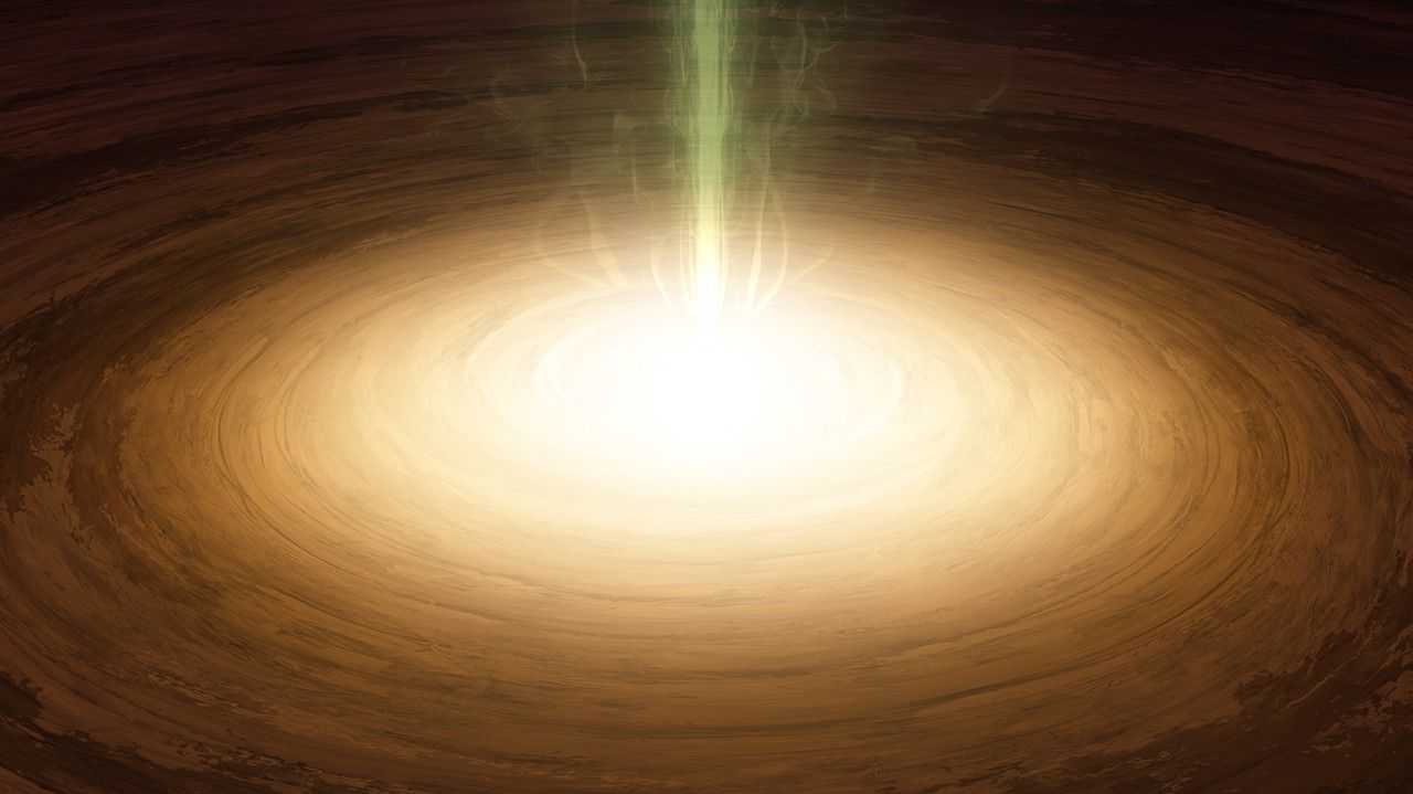 This illustration shows a young star undergoing a type of growth spurt. Left panel: Material from the dusty and gas-rich disk (orange) plus hot gas (blue) mildly flows onto the star, creating a hot spot. Middle panel: The outburst begins - the inner disk is heated, more material flows to the star, and the disk creeps inward. Right panel: The outburst is in full throttle, with the inner disk merging into the star and gas flowing outward (green).