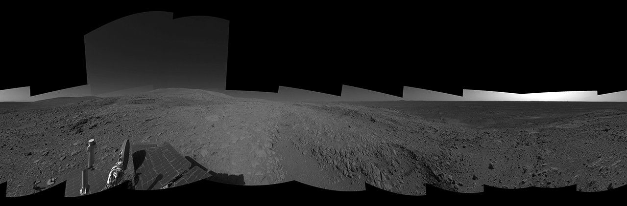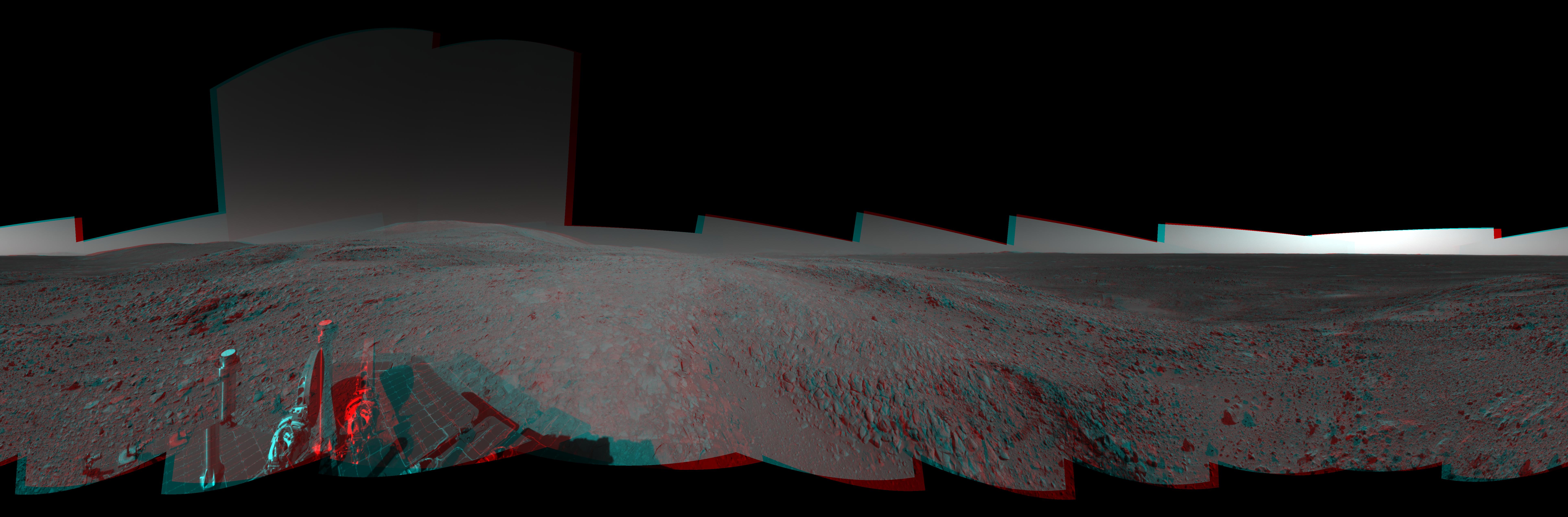 This 360-degree view combines frames taken by the navigation camera on NASA's Mars Exploration Rover Spirit during the rover's 271st martian day, or sol, on Oct. 7, 2004. The rover had just driven into position for using the tools on its robotic arm (not in the picture) to examine a layered rock called "Tetl" in the "Columbia Hills." Spirit's total driving distance from its landing to this point was 3,641 meters (2.26 miles), more than six times the distance set as a criterion for mission success. The three-dimensional view is presented here in a cylindrical projection with geometric seam correction.