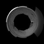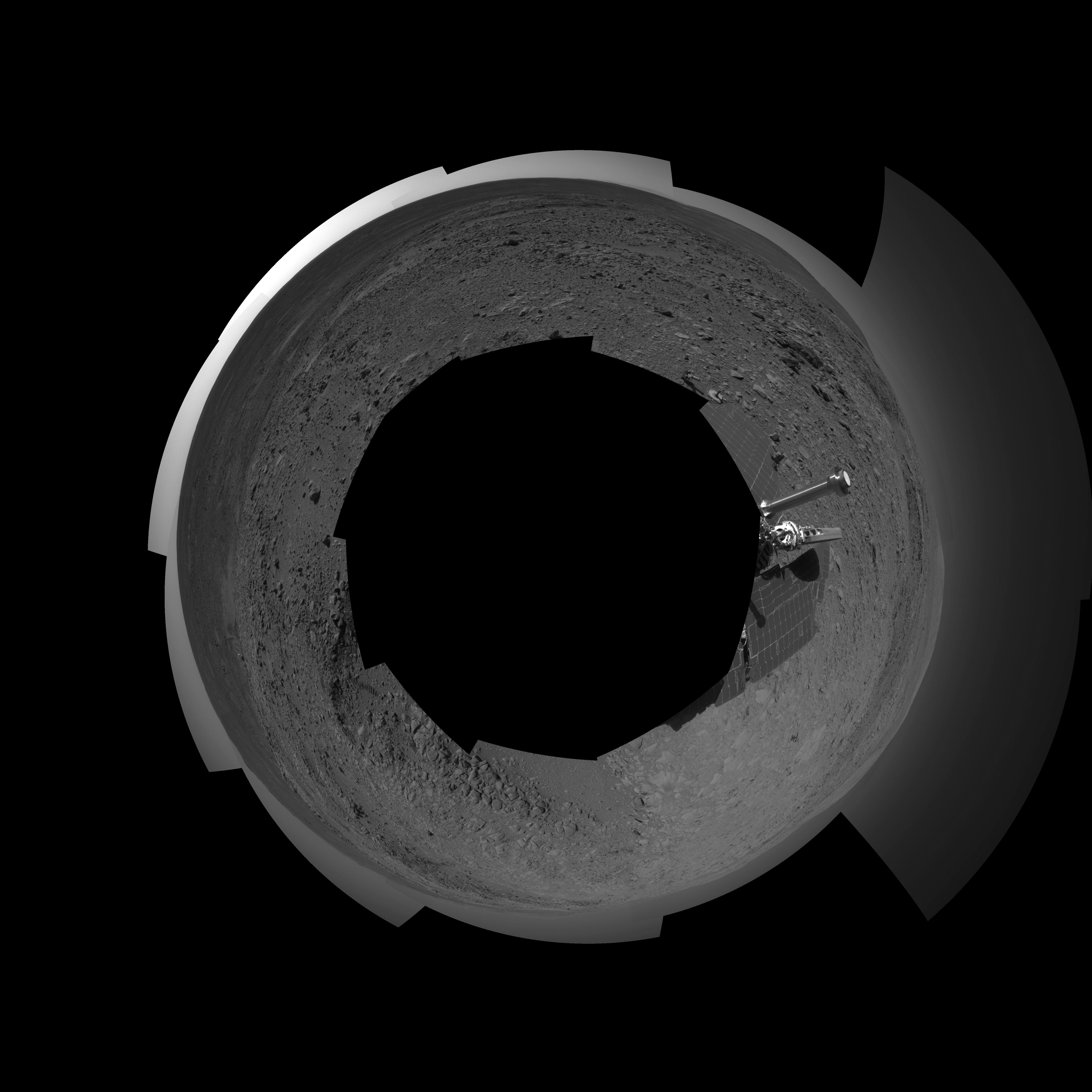 This 360-degree view combines frames taken by the navigation camera on NASA's Mars Exploration Rover Spirit during the rover's 271st martian day, or sol, on Oct. 7, 2004. The rover had just driven into position for using the tools on its robotic arm (not in the picture) to examine a layered rock called "Tetl" in the "Columbia Hills." Spirit's total driving distance from its landing to this point was 3,641 meters (2.26 miles), more than six times the distance set as a criterion for mission success. The view presented here in a polar projection with geometric seam correction.