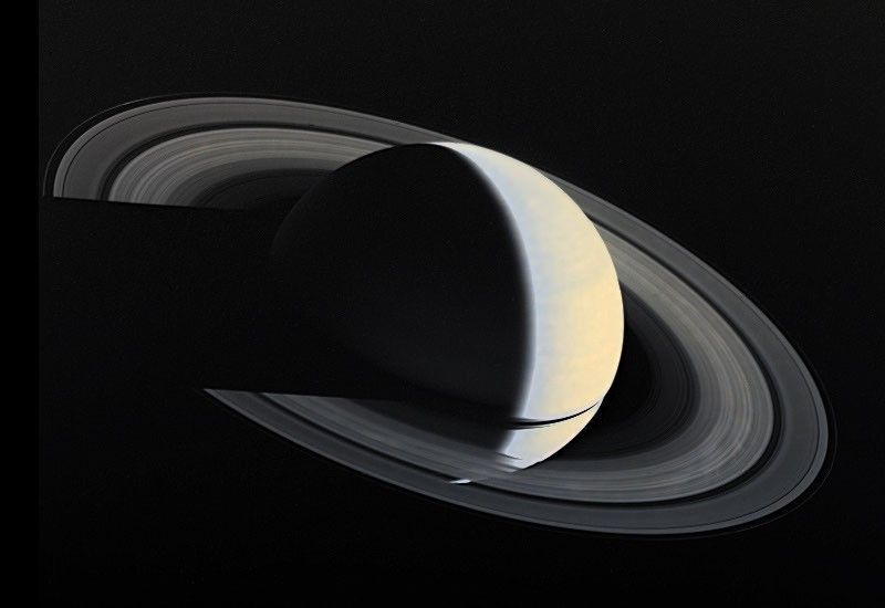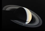 Voyager 1 image of Saturn and its ring taken Nov. 16, 1980 four days after closest approach to Saturn, from a distance of 5,300, 000 km (3,300,000 miles). This viewing geometry, which shows Saturn as a crescent, is never achieved from Earth. The Saturnian rings, like the cloud tops of Saturn itself, are visible because they reflect sunlight. The translucent nature of the rings is apparent where Saturn can be seen through parts of the rings. Other parts of the rings are so dense with orbiting ice particles that almost no sunlight shines through them and a shadow is cast onto the yellowish cloud tops of Saturn, which in turn, casts a shadow across the rings at right. The black strip within the rings is the Cassini Division, which contains much less orbiting ring material than elsewhere in the rings.