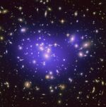 Dark matter in the cluster, which represents about 80 percent of its mass, is mapped by plotting these arcs. Dark matter cannot be photographed, but its distribution is shown in the blue overlay. The dark matter distribution is then used to better understand the nature of dark energy, a pressure that is accelerating the expansion of the universe.