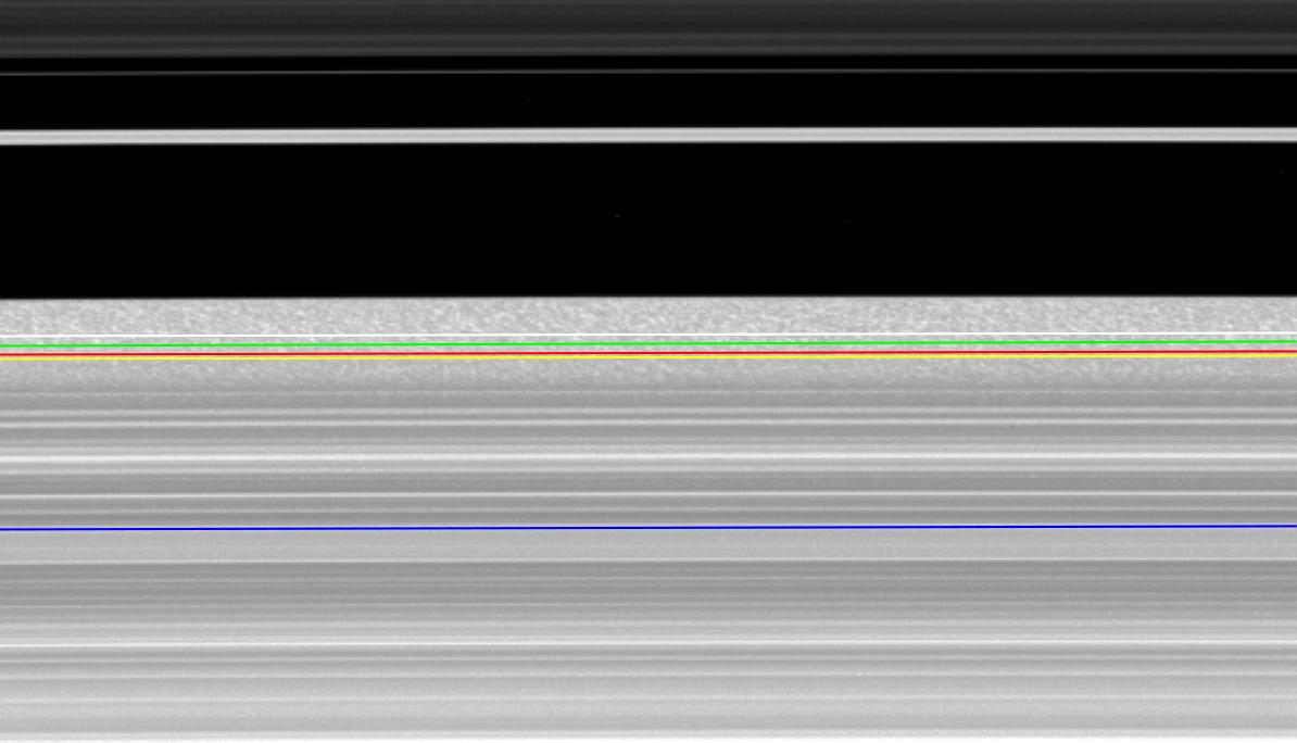 The position of the outer edge of the B ring, shown here crossing the middle of the frame, varies with time in this concatenation of 301 images taken an average of 1 minute, 50 seconds apart, over the span of about nine hours. The total variation of the edge, from the innermost to outermost locations, is 200 kilometers (120 miles). The eccentric Huygens Ringlet, another very narrow ringlet discovered by Cassini, and the innermost of the bands of ring material in the Cassini Division, a low-density region once thought to be empty, all appear in the top of the frame.