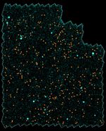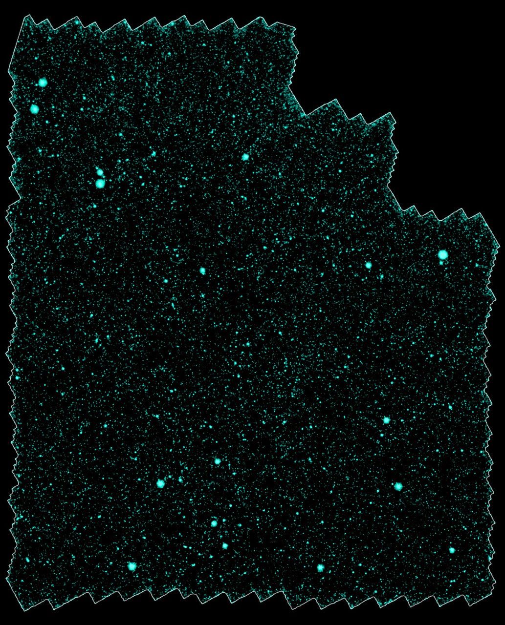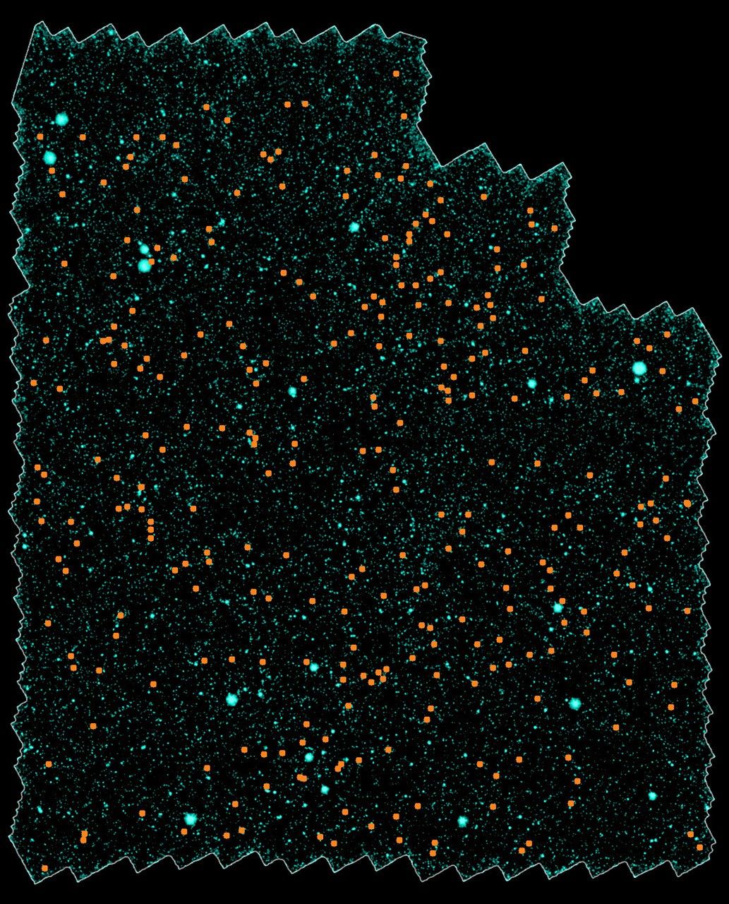A mosaic portraying a bird's eye view of the field in which the distant clusters were found is shown at upper left. It spans a region of sky 40 times larger than that covered by the full moon as seen from Earth. Thousands of individual images from Spitzer's infrared array camera instrument were stitched together to create this mosaic. The distant clusters are marked with orange dots.