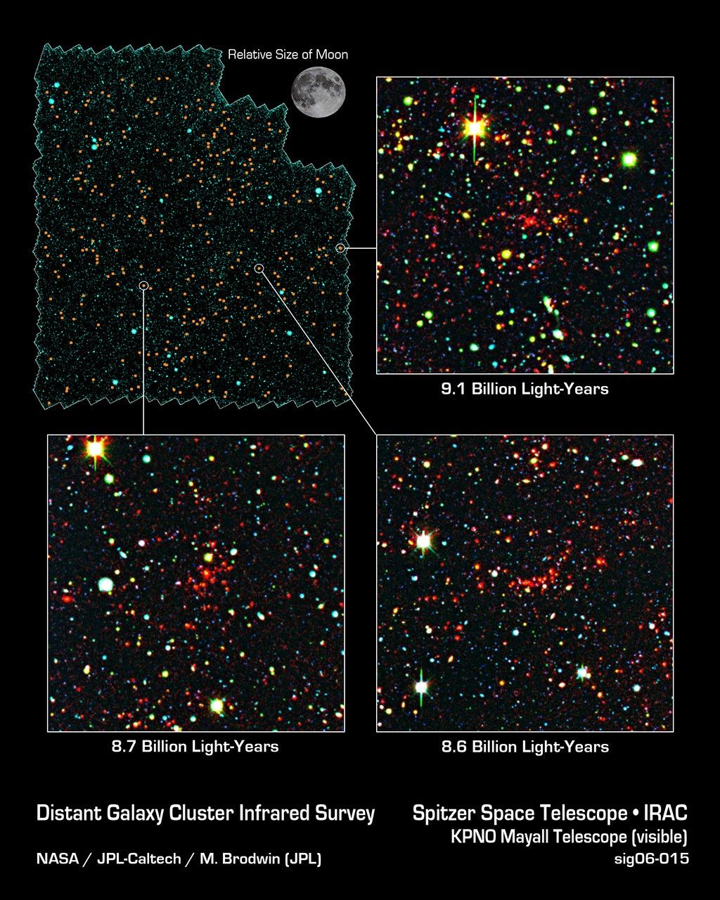 Close-up images of three of the distant galaxy clusters are shown in the adjoining panels. The clusters appear as a concentration of red dots near the center of each image. These images reveal the galaxies as they were over 8 billion years ago, since that's how long their light took to reach Earth and Spitzer's infrared eyes.