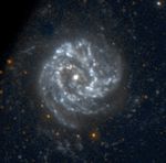 This image of the spiral galaxy Messier 83 was taken by NASA's Galaxy Evolution Explorer on June 7, 2003. Located 15 million light years from Earth and known as the Southern Pinwheel Galaxy, Messier 83 displays significant amounts of ultraviolet emissions far from the optically bright portion of the galaxy. It is also known to have an extended hydrogen disc that appears to radiate a faint ultraviolet emission. The red stars in the foreground of the image are Milky Way stars.