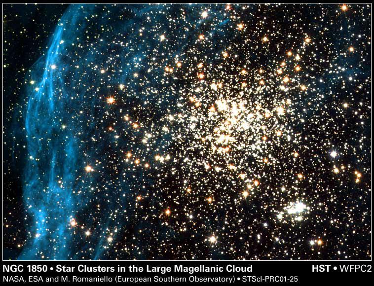 NGC 1850, the brightest star cluster in the Large Magellanic Cloud, is in the southern constellation of Dorado, called the Goldfish or the Swordfish. This image was created from five archival exposures taken by the Wide Field Planetary Camera 2 between April 3, 1994 and February 6, 1996. Additional information about the Hubble Space Telescope is available at http://www.stsci.edu/hst/. More information about the Wide Field and Planetary Camera 2 is available at http://www.stsci.edu/hst/wfpc2.