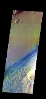 The THEMIS VIS camera contains 5 filters. The data from different filters can be combined in multiple ways to create a false color image. These false color images may reveal subtle variations of the surface not easily identified in a single band image. Today's false color image shows part of Gale Crater, the home of Curiosity Rover.