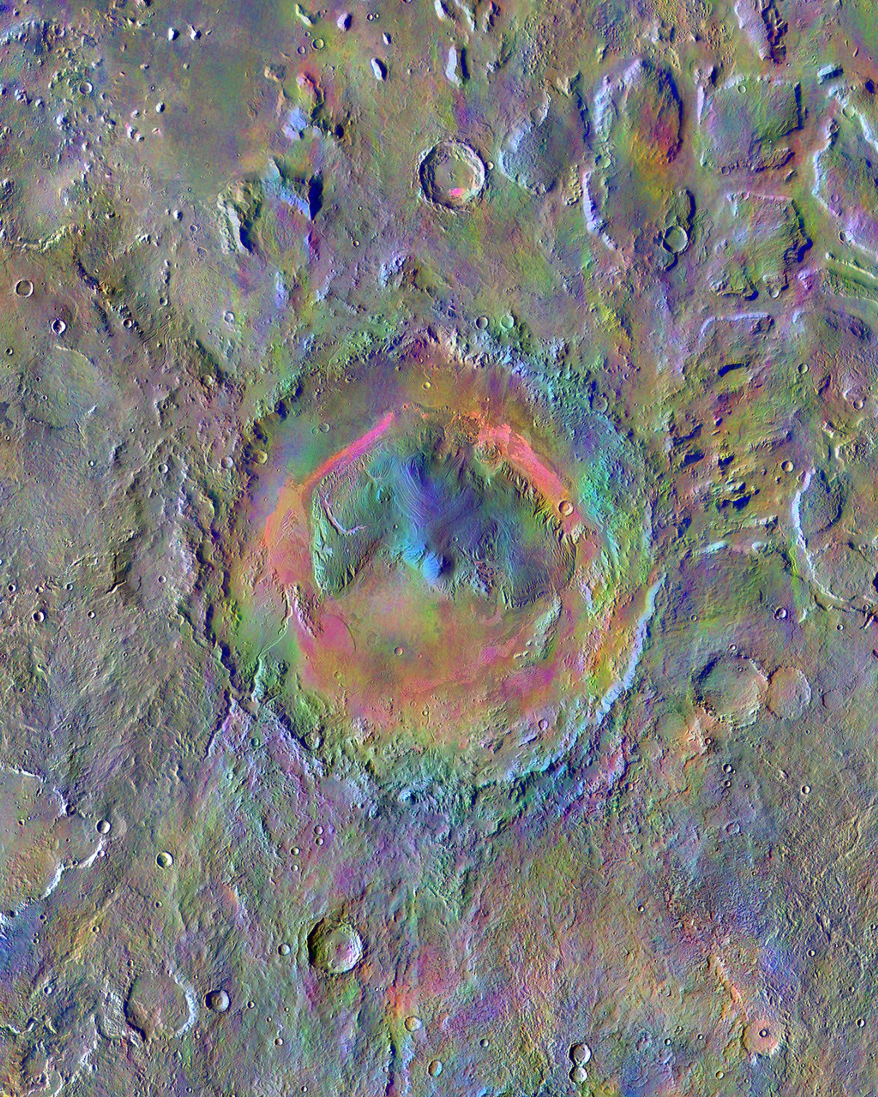 The colors come from an image processing technique that identifies mineral differences in surface materials and displays them in false colors. For example, windblown dust appears pale pink and olivine-rich basalt looks purple. The bright pink on Gale's floor appears due to a mix of basaltic sand and windblown dust. The blue at the summit of Gale's central mound, Mount Sharp, probably comes from local materials exposed there. The typical average Martian surface soil looks grayish-green. Scientists use false-color images such as these to identify places of potential geologic interest.