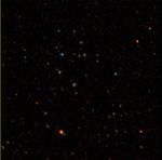 NASA's Galaxy Evolution Explorer took this image on May 21 and 22. The image was made from data gathered by the two channels of the spacecraft camera during the mission's "first light" milestone. It shows about 100 celestial objects in the constellation Hercules. The reddish objects represent those detected by the camera's near ultraviolet channel over a 5-minute period, while bluish objects were detected over a 3-minute period by the camera's far ultraviolet channel.