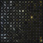 For the poster, Galex scientists organized 196 different nearby galaxies in bins of increasing ultraviolet color. By placing the various snapshots side by side, astronomers can see how galaxies age differently. When viewed in ultraviolet, active star-forming regions in galaxies can be seen as glittering blue structures, while a soft, golden glow indicates the presence of older stars.