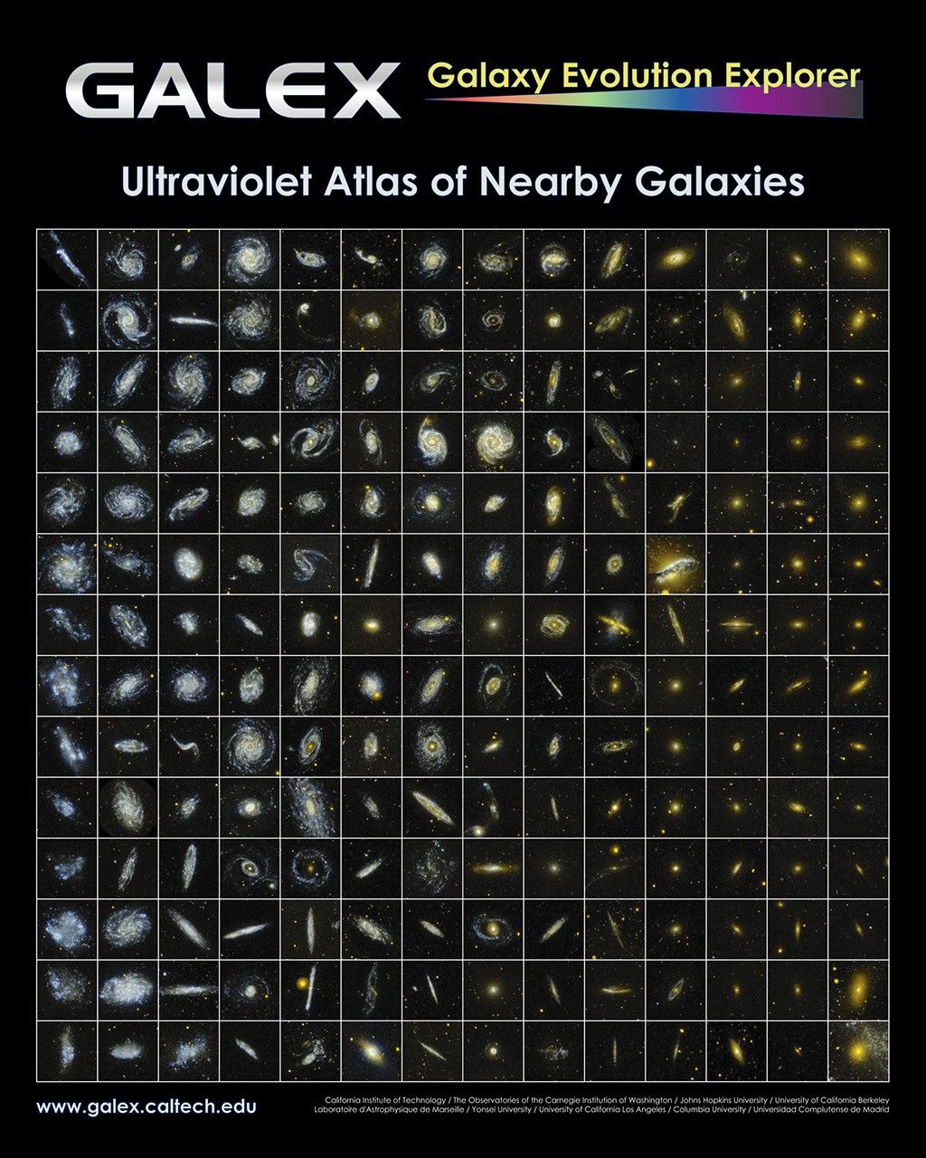The 196 galaxies represented in the poster were selected from more than 1,000 galaxies in the "Ultraviolet Atlas of Nearby Galaxies." So far, the Galex mission has surveyed more than 100 million galaxies.