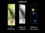 This image of Amirani was taken at a distance of less than 25,000 kilometers (16,000 miles). The picture scale is approximately 6.5 kilometers (4 miles) per spectrometer pixel. The center and right images show views of Amirani as seen by the spectrometer at two wavelengths, 1.0 and 4.6 microns. These images can be compared with a visible wavelength image (on the left) of the same area obtained by Galileo's camera during a previous orbit. The visible light image shows extensive lava flows and a dark-floored caldera with associated bright red deposits of material fed from the volcano. The spectrometer observation was made in daylight. The center image, taken at a wavelength of 1 micron, shows light and dark areas on the surface that can be used to line up the spectrometer data with the camera image. The image on the right shows the same area at a wavelength of 4.6 microns, which reveals the thermal emission from three separate volcanic areas. The locations of these three "hot spots" correspond to the darkest features in the camera image, reinforcing a previously held belief by Galileo scientists that there is a correlation between the dark areas and the hot spots.