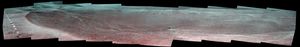 This stereo view from NASA's Mars Exploration Rover Opportunity looks upward at 'Knudsen Ridge' on the southern edge of 'Marathon…
