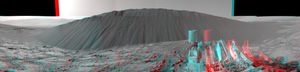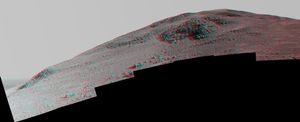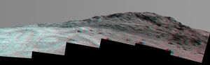 This stereo view from NASA's Mars Exploration Rover Opportunity looks upward at 'Knudsen Ridge' on the southern edge of 'Marathon…
