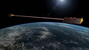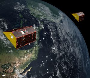 Illustration of the twin spacecraft of the NASA/German Research Centre for Geosciences (GFZ) GGRACE-FO mission. GRACE-FO will continue tracking the…