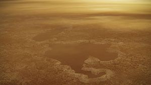 This artist's concept of a lake at the north pole of Saturn's moon Titan illustrates raised rims and rampartlike features…