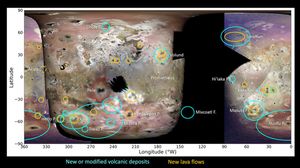 This global map of Jupiter's moon Io shows the volcanic activity and other surface changes detected by the JunoCam instrument.