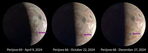 Images of Io captured in 2024 by the JunoCam imager aboard NASA's Juno show significant and visible surface changes near…