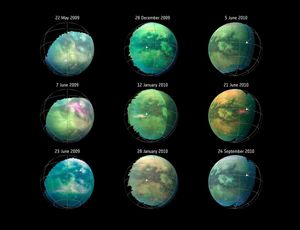 This compilation of images from nine flybys of Titan by NASA's Cassini spacecraft in 2009 and 2010 captures three instances…