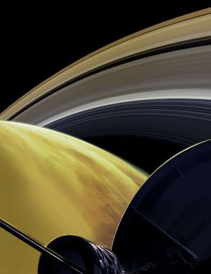 This illustration imagines the view from NASA's Cassini spacecraft during one of its final dives between Saturn and its innermost…