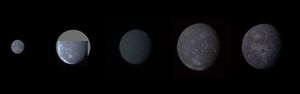 Montage of Uranus' five largest satellites taken by NASA's Voyager 2. From to right to left in order of decreasing…
