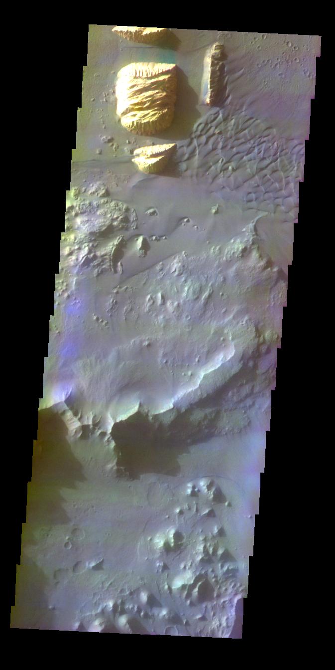 Note: this THEMIS visual image has not been radiometrically nor geometrically calibrated for this preliminary release. An empirical correction has been performed to remove instrumental effects. A linear shift has been applied in the cross-track and down-track direction to approximate spacecraft and planetary motion. Fully calibrated and geometrically projected images will be released through the Planetary Data System in accordance with Project policies at a later time.
