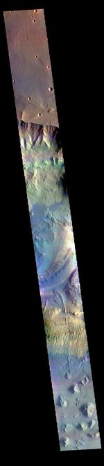 The THEMIS VIS camera contains 5 filters. The data from different filters can be combined in multiple ways to create a false color image. These false color images may reveal subtle variations of the surface not easily identified in a single band image. Today's false color image shows part Ganges Chasma.