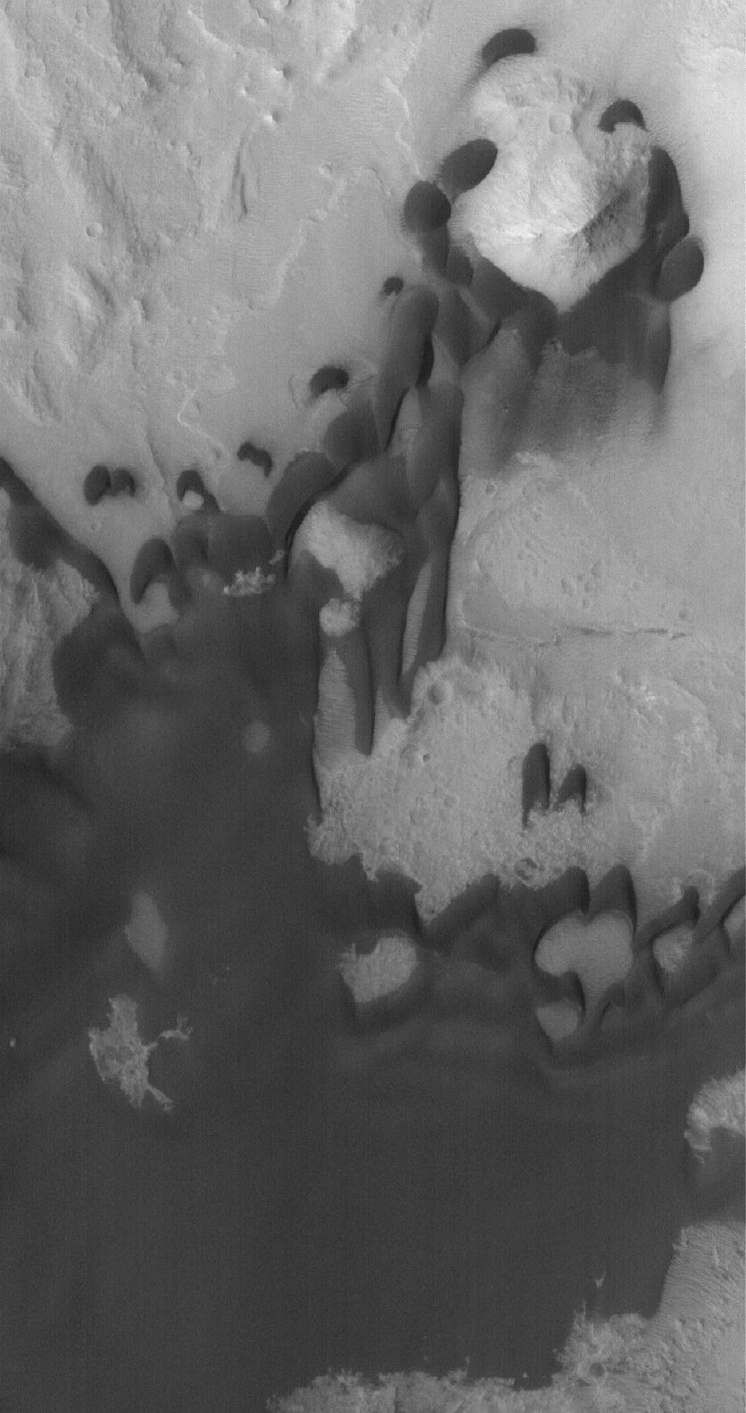 This Mars Global Surveyor (MGS) Mars Orbiter Camera (MOC) image shows dark, windblown sand in the form of dunes and a broad, relatively flat, sand sheet in Ganges Chasma, part of the eastern Valles Marineris trough complex. The winds responsible for these dunes blew largely from the north. Sand dunes on Mars, unlike their Earthly counterparts, are usually dark in tone. This is a reflection of their composition, which includes minerals that are more rich in iron and magnesium than the common silica-rich dunes of Earth. Similar dark sands on Earth are found in volcanic regions such as Iceland and Hawaii. A large dune field of iron/magnesium-rich grains, in the form fragments of the volcanic rock, basalt, occurs south of Moses Lake, Washington, in the U.S.