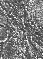 Ancient impact craters shown in this image of Jupiter's moon Ganymede taken by NASA's Galileo spacecraft testify to the great age of the terrain, dating back several billion years. At the margin at the left, half of a 19-kilometer-diameter (12-mile) crater is visible. The dark and bright lines running from lower right to upper left and from top to bottom are deep furrows in the ancient crust of dirty water ice. The origin of the dark material is unknown, but it may be accumulated dark fragments from many meteorites that hit Ganymede. In this view, north is to the top, and the sun illuminates the surface from the lower left about 58 degrees above the horizon. The area shown is part of Ganymede's Galileo Regio region at latitude 18 degrees north, longitude 147 degrees west; it is about 46 by 64 kilometers (29 by 38 miles) in extent. Resolution is about 80 meters (262 feet) per pixel. The image was taken June 27 at a range of 7.563 kilometers (4,700 miles). The Jet Propulsion Laboratory manages the Galileo mission for NASA's Office of Space Science.