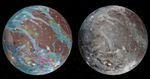 To present the best information in a single view of Jupiter's moon Ganymede, a global image mosaic was assembled, incorporating the best available imagery from NASA's Voyager 1 and 2 spacecraft and NASA's Galileo spacecraft. This image shows Ganymede centered at 200 west longitude. This mosaic (right) served as the base map for the geologic map of Ganymede (left).