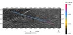 The JIRAM data is represented by the colored line running from the upper left to lower right in the graphic. The line depicts an increase in intensity of the spectral signature of a non-ice compound, possibly ammonium chloride, in the groove at the lower right of the image.