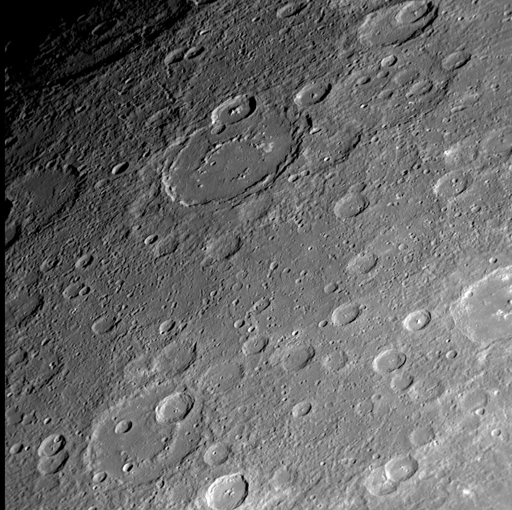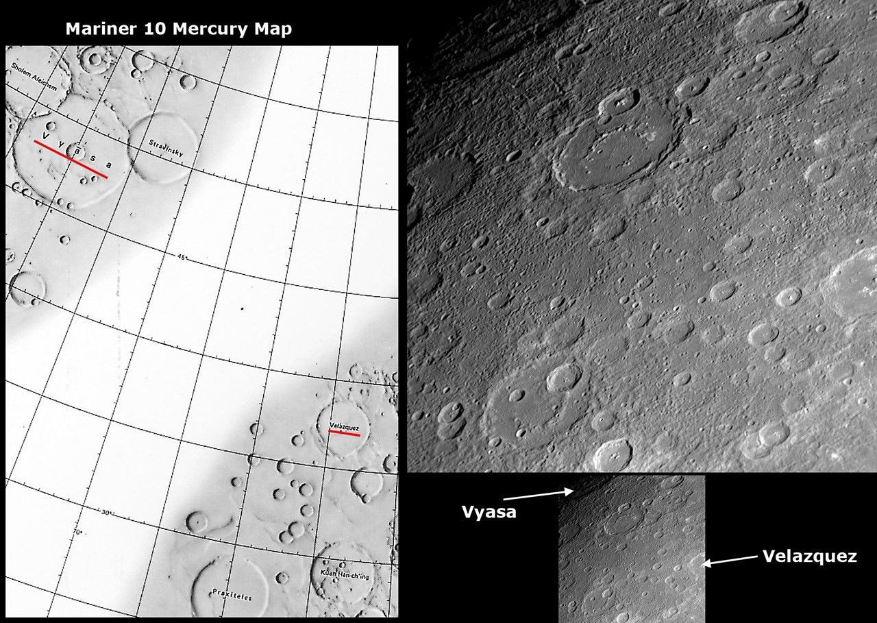 The Mariner 10 mission imaged about 45% of Mercury’s surface, but a region in the northeastern portion of the side of the globe studied by that mid-1970s spacecraft had no imaging coverage, resulting in a distinctive "gore" on the Mariner 10 map of Mercury’s surface. The left side of this figure shows a portion of the Mariner 10 map with the "gore." MESSENGER’s recent Mercury flyby provided the first spacecraft images of much of the surface within the Mariner 10 "gore," and the specific NAC image on the right is located within the "gore" (PIA11354). Mariner 10 imaged the craters Vyasa (named for the ancient Indian poet) and Velazquez (named for the 17th century Spanish painter) but not the region between these two craters, the names of which are underlined in red on the left side Mariner 10 map. The upper center of the NAC image shows a newly seen large crater with a smooth floor and an incompletely developed or partially buried interior peak-ring structure.