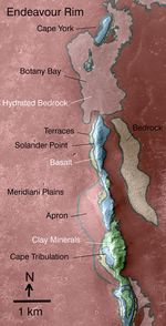 The rover team plans to begin Opportunity's exploration of the Endeavour rim near "Cape York," which is about 6.5 kilometers (4 miles) from the rover's location in mid-December 2010. Cape York is nearly surrounded by exposures of hydrated bedrock. From there, the planned exploration route goes south along the rim fragment "Solander Point," to "Cape Tribulation," where clay minerals have been detected.