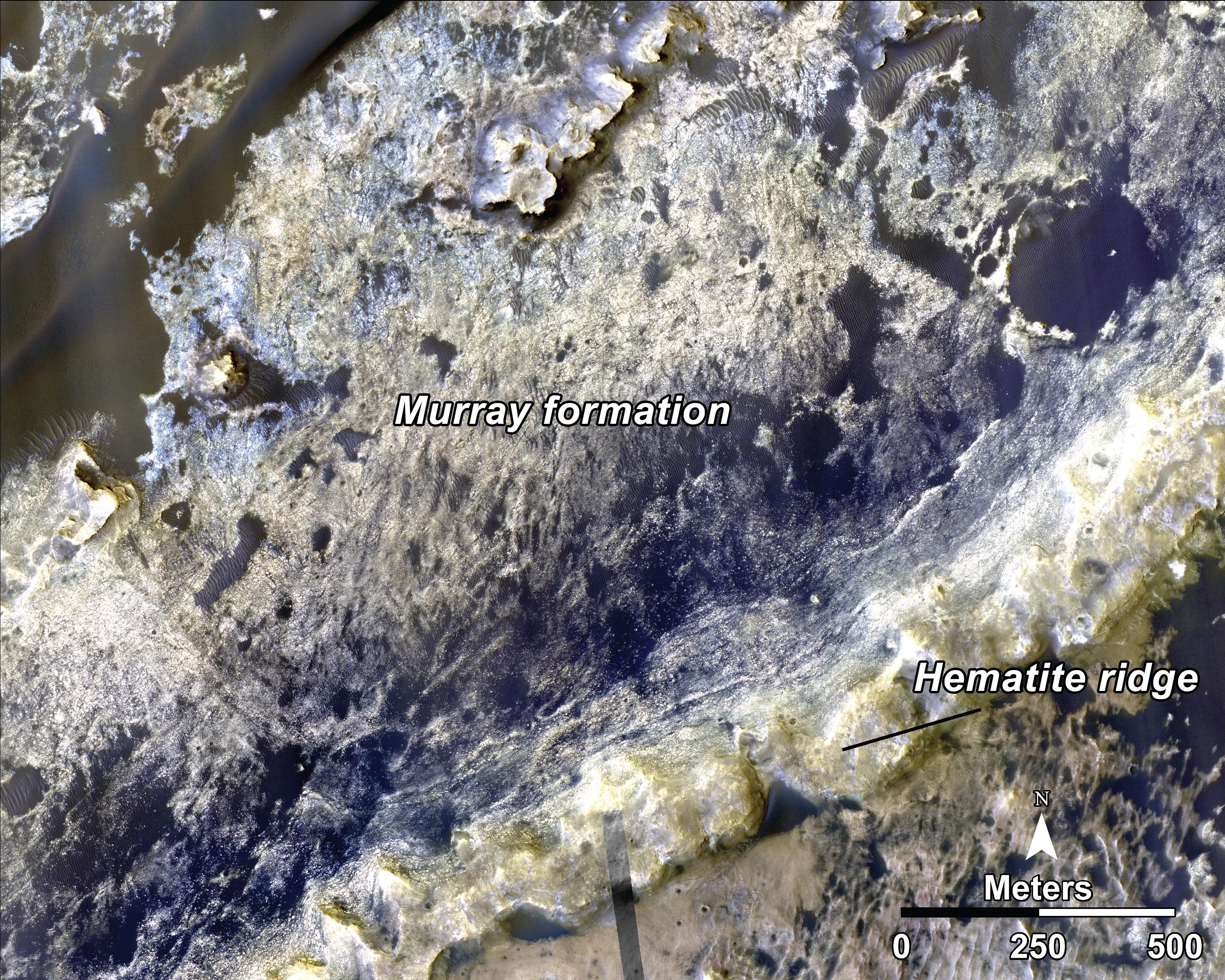 This image, taken with the High Resolution Imaging Science Experiment (HiRISE) camera, shows the transition between the "Murray Formation," in which layers are poorly expressed and difficult to trace from orbit, and the hematite ridge, which is made up of continuous layers that can be traced laterally for hundreds of meters. Orbital data shows that this change in bedding style between the Murray formation and the hematite ridge is also accompanied by a major change in layer composition. NASA's Curiosity rover will be exploring this formation.
