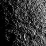 The brightly illuminated, prominent impact crater near the bottom middle of this image has been dissected by numerous parallel faults that run diagonally across the image. The presence of the faults that cut through the crater and the movement of surface materials have made the crater outline somewhat non-circular. Near the center of the image, running diagonally from the left to right, is an old graben, or linear depression of terrain between faults. See PIA07736 and PIA07734 for images showing geologic features on Tethys taken during an earlier flyby.