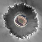 This photo composite shows an aerial view of FedEx Field in Landover, Md., home of the Washington Redskins, superimposed on Mars' Victoria Crater to give a sense of the crater's scale.
