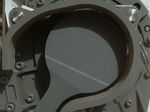 The image also shows sand and angular and rounded pebbles that were deposited on the rover deck when it landed.