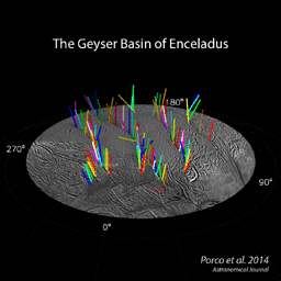 This graphic shows a 3-D model of 98 geysers whose source locations and tilts were found in a Cassini imaging survey of Enceladus' south polar terrain by the method of triangulation. While some jets are strongly tilted, it is clear the jets on average lie in four distinct "planes" that are normal to the surface at their source location.