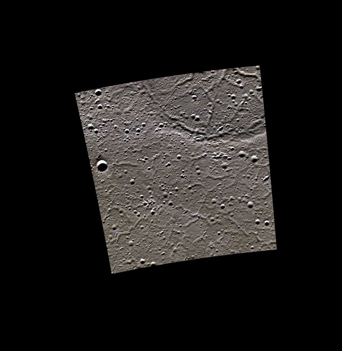 This image shows a lava flow that has filled in a neighboring crater (top right), leaving only a trace of the covered crater rim at the surface. These filled craters are referred to as ghost craters. The lines seen forming a network of cracks across the surface are called troughs. Troughs formed as the lava flow cooled, and the surface was cracked and faulted.