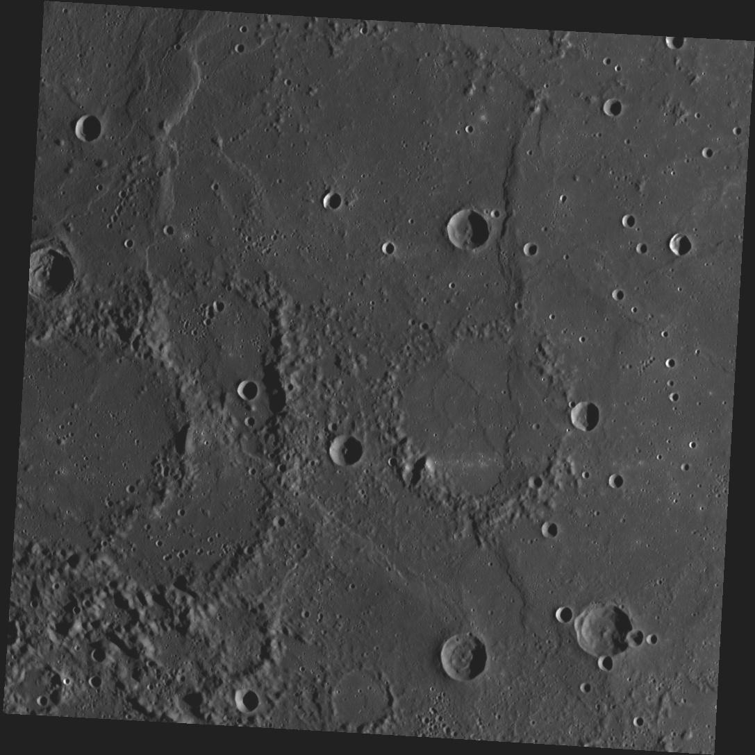 This image, taken with the Wide Angle Camera (WAC), shows an area of smooth volcanic plains in Mercury's northern hemisphere. Looking closely, we can see the faint outline of an impact crater near the center of the image and two neighboring craters on the left side of the image. The crater floors were flooded with lava, leaving only the very tops of the crater rims visible. We can also see a number of wrinkle-like features, called wrinkle ridges, which are often found in smooth plains like these.