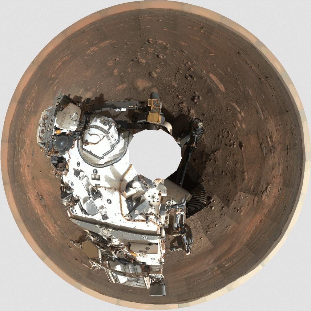 This GIF shows the order in which the 142 images that make up Mastcam-Z's first 360-degree panorama were taken. Mastcam-Z is a pair of zoomable cameras on the mast, or "head," of NASA's Perseverance Mars rover.