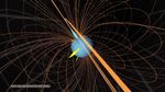 An animated GIF showing Uranus' magnetic field. The yellow arrow points to the Sun, the light blue arrow marks Uranus' magnetic axis, and the dark blue arrow marks Uranus' rotation axis.