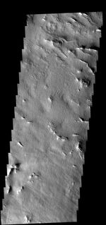 Note: this THEMIS visual image has not been radiometrically nor geometrically calibrated for this preliminary release. An empirical correction has been performed to remove instrumental effects. A linear shift has been applied in the cross-track and down-track direction to approximate spacecraft and planetary motion. Fully calibrated and geometrically projected images will be released through the Planetary Data System in accordance with Project policies at a later time.